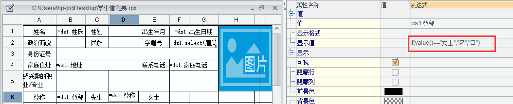 将 D6 单元格的显示值表达式定义为 if(value()==“女士”,“☑”,“□”。