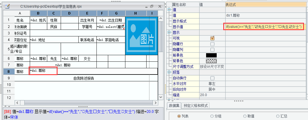 若果实现多个勾选项在一个单元格进行判断 B8 单元格的表达式为 ds1. 尊称,单元格的显示值表达式为:if(value()==“先生”,“☑先生□女士”,“□先生☑女士”),根据当前单元格的值进行判断,分别显示不同的两种勾选效果,具体设置可以参考下图。