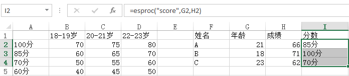 在 I2 格输入公式:=esproc("score",G2,H2),并以扩展方式填充后续分数列,即可算出结果。