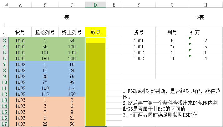 1.F3跟 A 列对比判断,是否绝对匹配,获得范围。