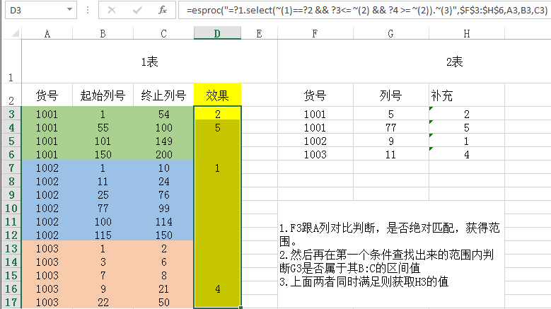 在 D3 格输入公式:=esproc("=?1.select(~(1)==?2 && ?3<= ~(2) && ?4 >= ~(2)).~(3)",$F$3:$H$6,A3,B3,C3),即可算出结果。后续格延用该表达式,参数 1 为 2 表的数据区域,参数 2 为 A 列的对应货号,参数 3 为 B 列的对应起始列号,参数 4 为 C 列的对应终止列号。