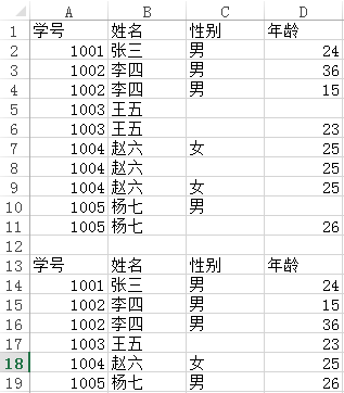 需要注意:学号和姓名相同,而年龄不同,说明其中有一行的数据有误,这就需要手动进行处理,不能够删除其中某一行。