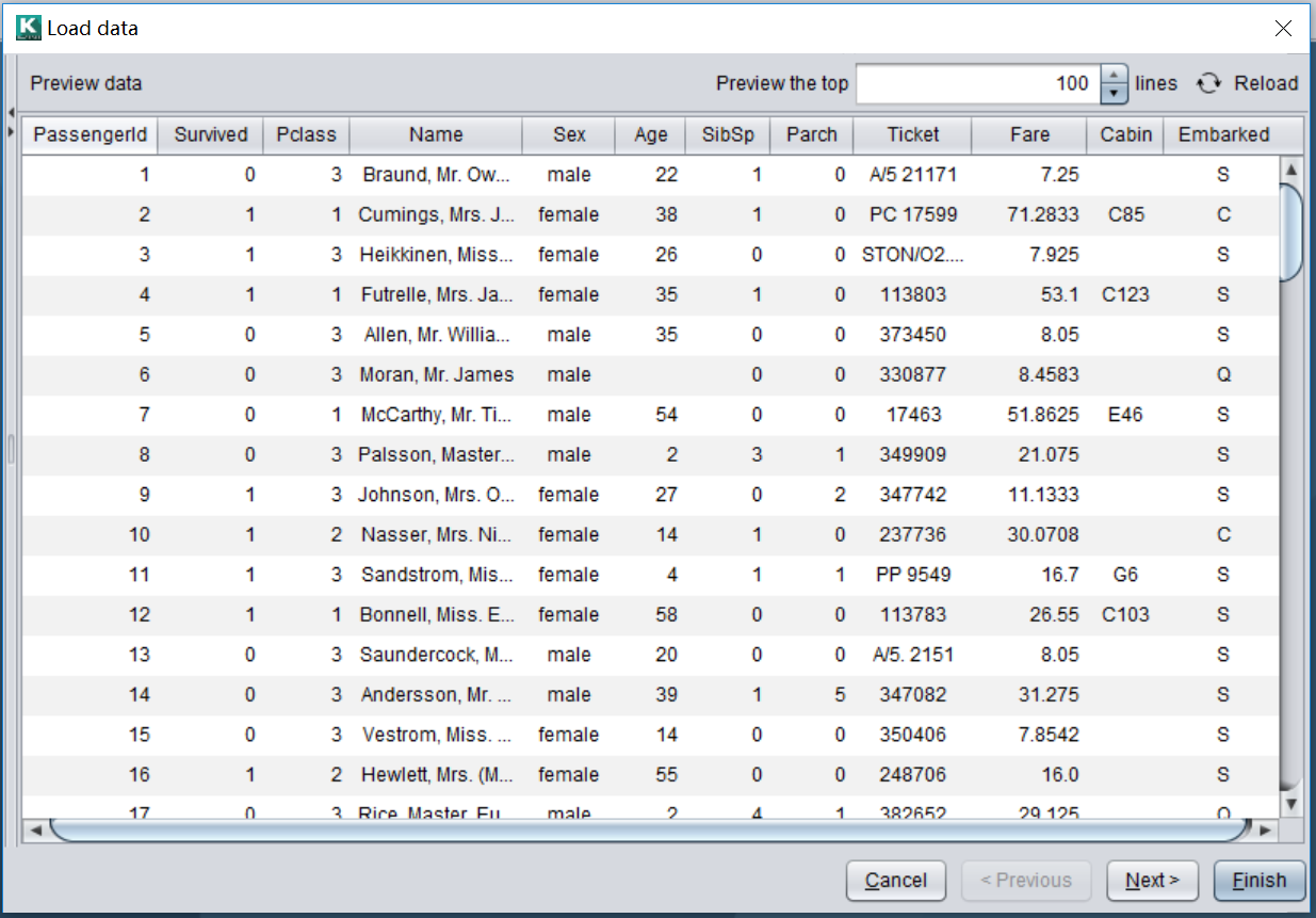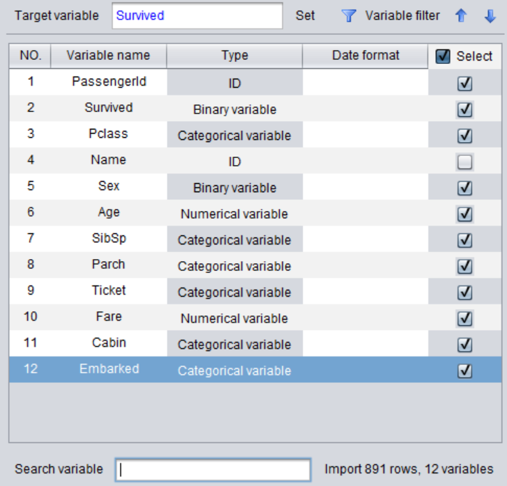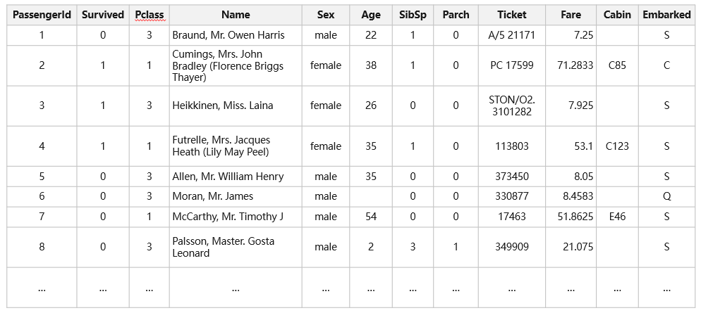 下面是 kaggle 上的经典案例,泰坦尼克生存预测为例来判断其变量的数据类型。数据部分截图如下,共计 12 个变量: