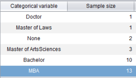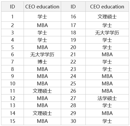 表中是 30 名 CEO 的受教育水平,我们将其导入易明建模软件 YModel,可以统计出,该组数据共包含博士、法学硕士、无大学学历、文理硕士、学士和 MBA 六个类别,每个类别的样本数量见下图,其中 MBA 学历的人数最多,其次是学士,两者占据了大多数。