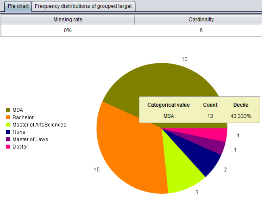 使用饼图可以非常直观的看到该数据共 6 个类别,占比情况 MBA 最多,占 43.333%,其次是学士。图形可视化的方法是数据分析中很重要的一部分。