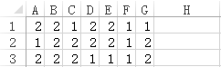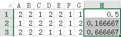 在 H1 格输入公式:=esproc("=(?.pselect@a(~:1).len()-1)/(?.len()-?.pselect(~:1))",A1:G1),其余单元格以此类推,即可算出结果。