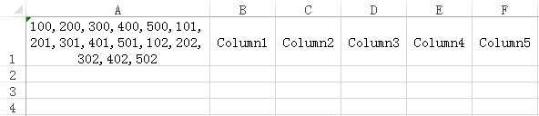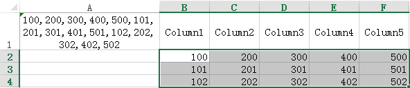 现在要将 A1 中的字符串按逗号拆分,格式化重整成 5 列 N 行带表头的表格,先横后纵,结果如下: