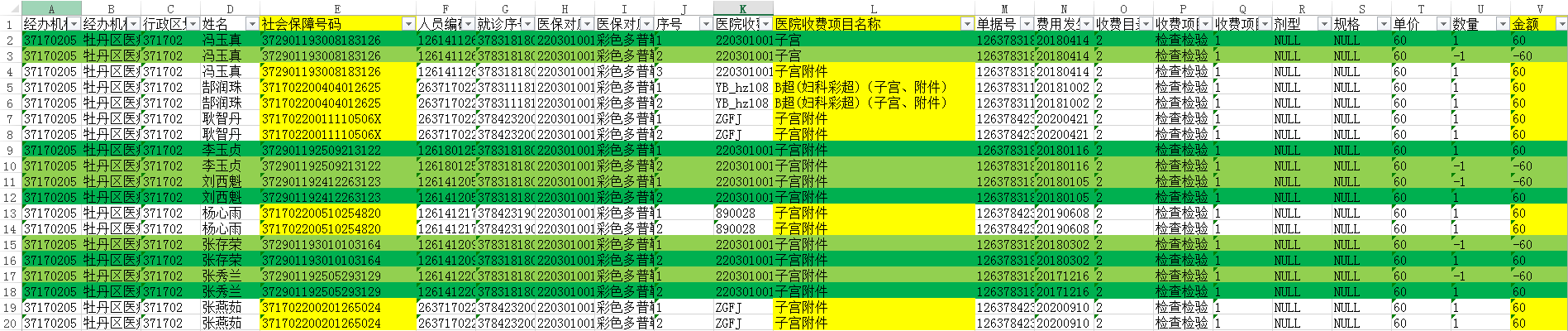需要把符合身份证号一致、收费项目一致、金额是一正一负的行数删掉(如深绿色和浅绿色的记录),结果如下: