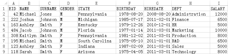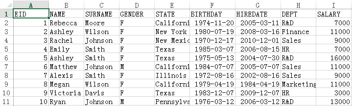 有 Excel 文件“emp.xlsx”,是雇员表,部分数据如下所示: