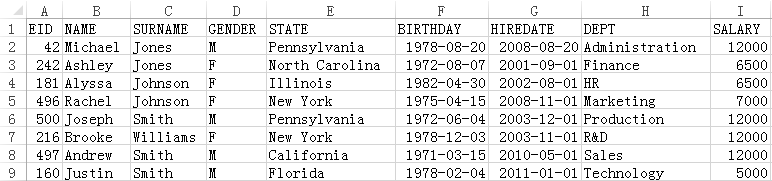 有 Excel 文件“emp.xlsx”,是雇员表,其中 EID 递增,部分数据如下所示: