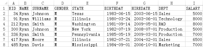有 Excel 文件“emp.xlsx”,是雇员表,部分数据如下所示: