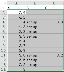 现在需要找到 B 列是 setup 的连续记录作为一组,组内寻找 A 列最小的值,写在组内第 1 行的新列 C 上,结果如下: