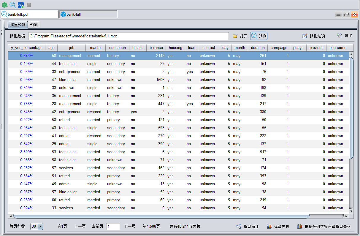 按钮,打开刚才生成的模型文件,导入要预测用户的数据集进行预测。预测完成后会计算出每个用户发生违约的概率值。