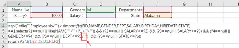 从表达式中可以看出,直接调用脚本文件的语法是:=spl("脚本文件名(?n……)",参数n….),脚本有几个参数,括号里就写几个问号,和传入参数的对应关系规则与直接写代码是一样的,都是?1对应第一个参数,?2对应第二个参数,依此类推