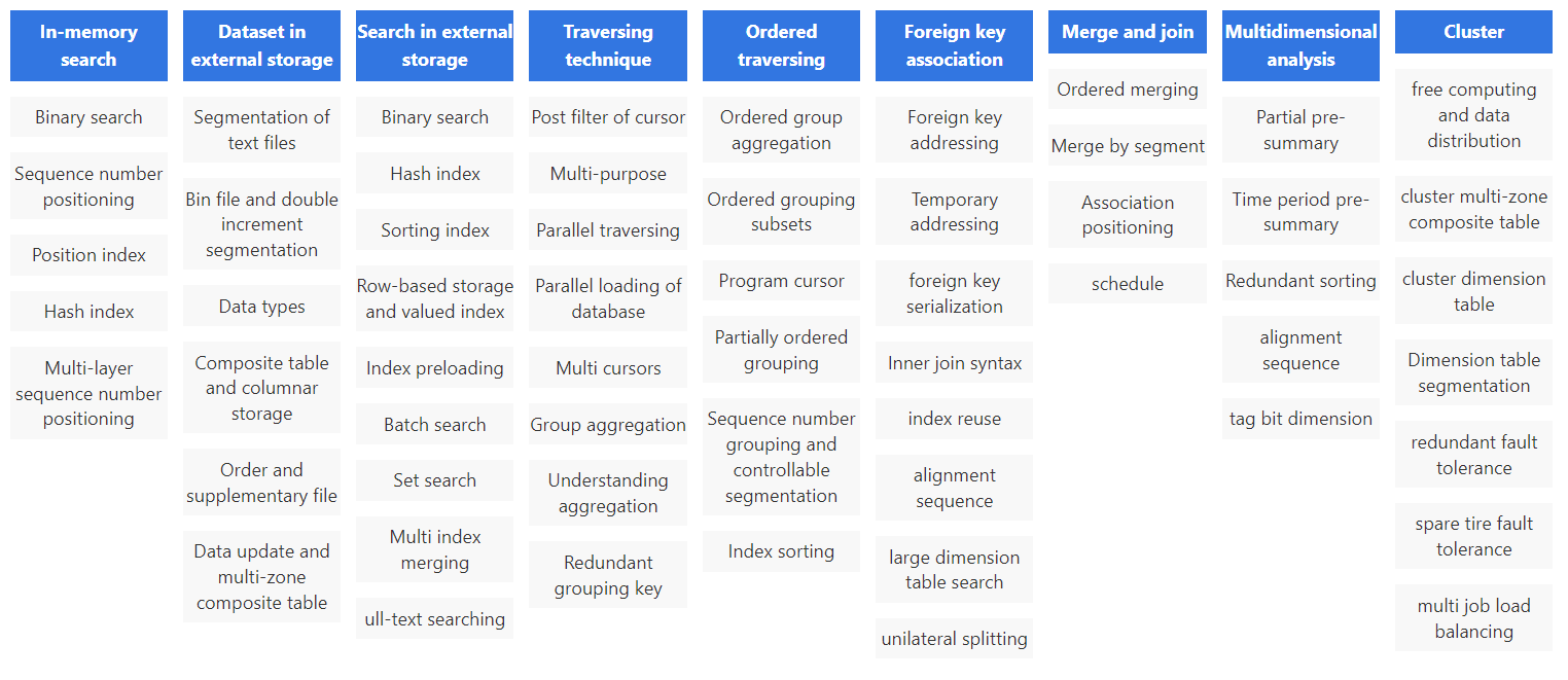 SPL 则不同,SPL 提供了诸多高效算法(和存储机制),很多都是 SPL 的独创发明,在业内首次提出,有了这些基础类库,快速写出高性能数据处理代码也就不奇怪了。