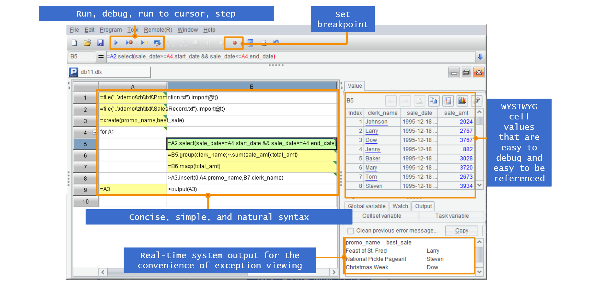 SPL 精心设计的语法易学易通;直接计算 Excel 文件,还能对着文件执行 SQL(SPL 提供了 SQL 大部分能力,学 SQL 可以不用安装数据库);一键式安装,特色网格代码很容易调试等……