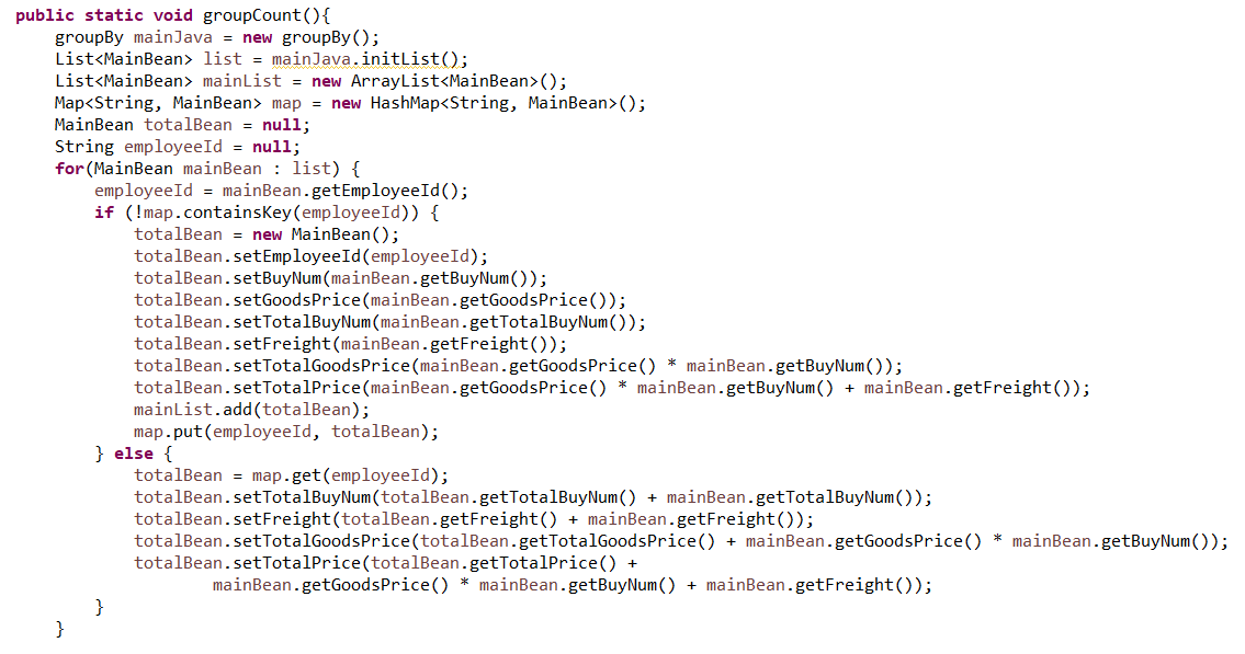 这种情况下,无 SQL 可用就只能使用 Java 等高级语言进行硬编码。但 Java 缺少必要的结构化计算类库,实现简单的分组汇总就要几十行代码,远没有 SQL 简单(一句 group by 就完事儿了)。比如在 Java 中完成一个简单的分组汇总要写成这样: