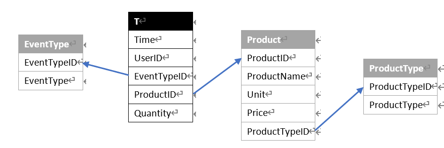 2、 用户事件表T和EventType的关联、Product表和ProductType的关联直接改成序号关联