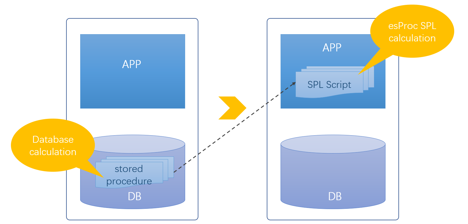 那么如何解决这个问题呢?我们稍加思考就会发现,之所以使用存储过程是因为要借助数据库的计算能力,SQL 纵有千般不好,但总比 Java 这些高级语言简单甚至高效得多,因此依赖数据库成了自然而然的事情。如果在库外计算也能达到相同的效果,当然可以替代存储过程。将存储过程移到库外,使用 SPL 实现“库外存储过程”就可以解决这些问题。