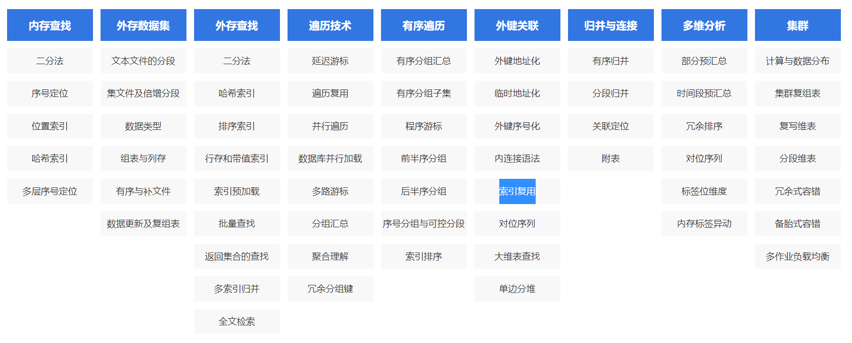 内存计算类的二分法、序号定位、位置索引、哈希索引、多层序号定位、……