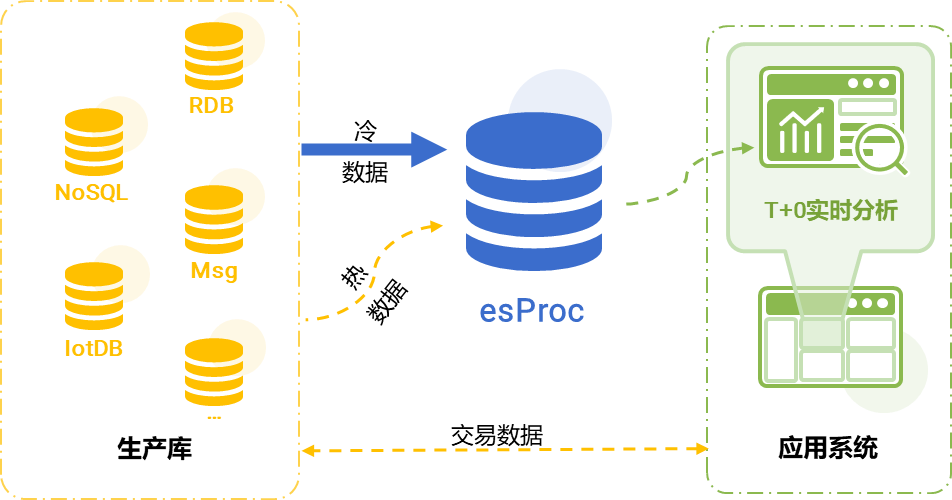 我们可以在原有独立 TP 和 AP 体系的基础上引入 esProc,借助其开放的跨源计算能力、高性能存储和计算能力、敏捷开发能力来实现 HTAP。