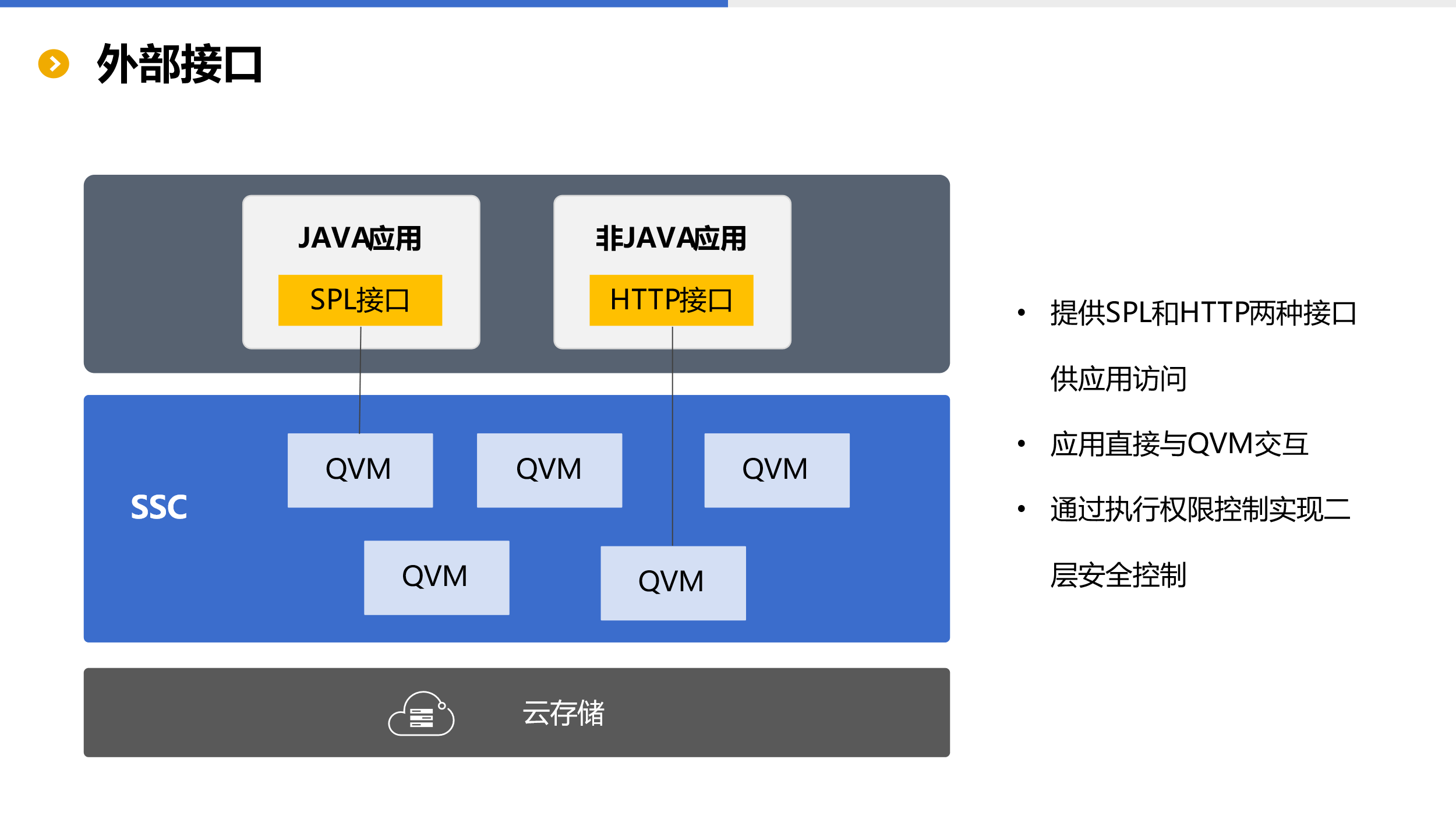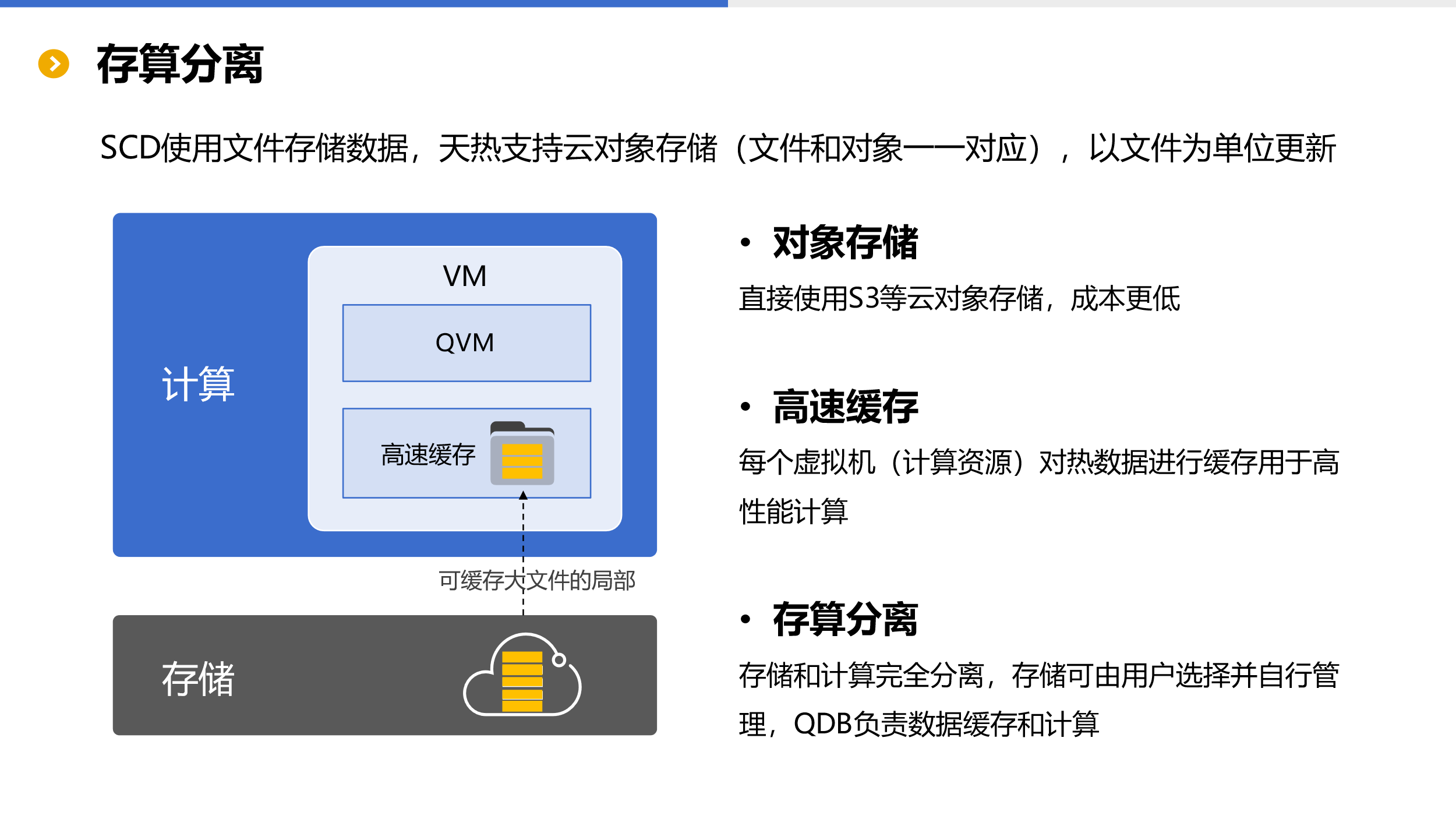 从架构可以明确看到 SSC 支持存储与计算分离。数据存储在云上对象存储中,由用户自行管理,而计算则由云上 SSC 的 QVM 完成。对象存储(如 S3)的成本很低,而 SSC 默认使用文件存储数据,文件与对象存储一一对应,可以完美实现相互转换。