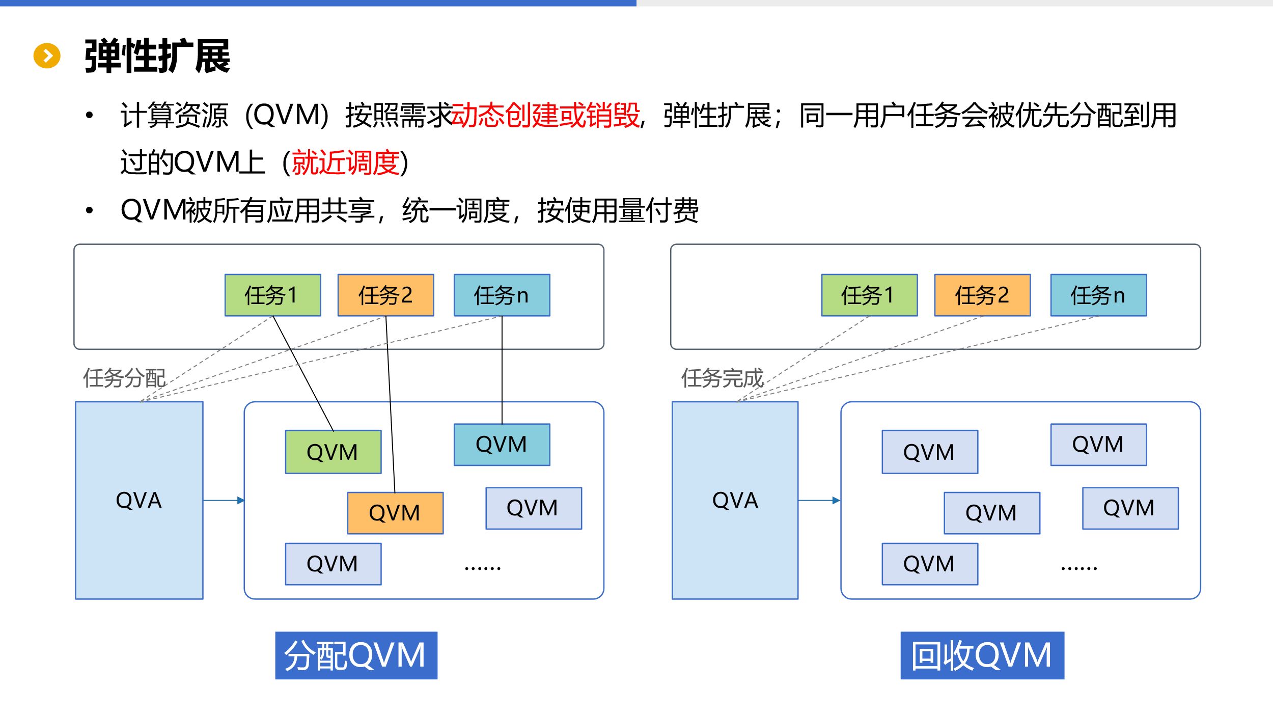 有了存算分离支持后,用户就可以根据需要单独对存储或计算资源进行扩展。云存储由用户自行管理不必多说。计算则由 QVA 根据需求动态创建或销毁计算资源(QVM),自动弹性扩展。