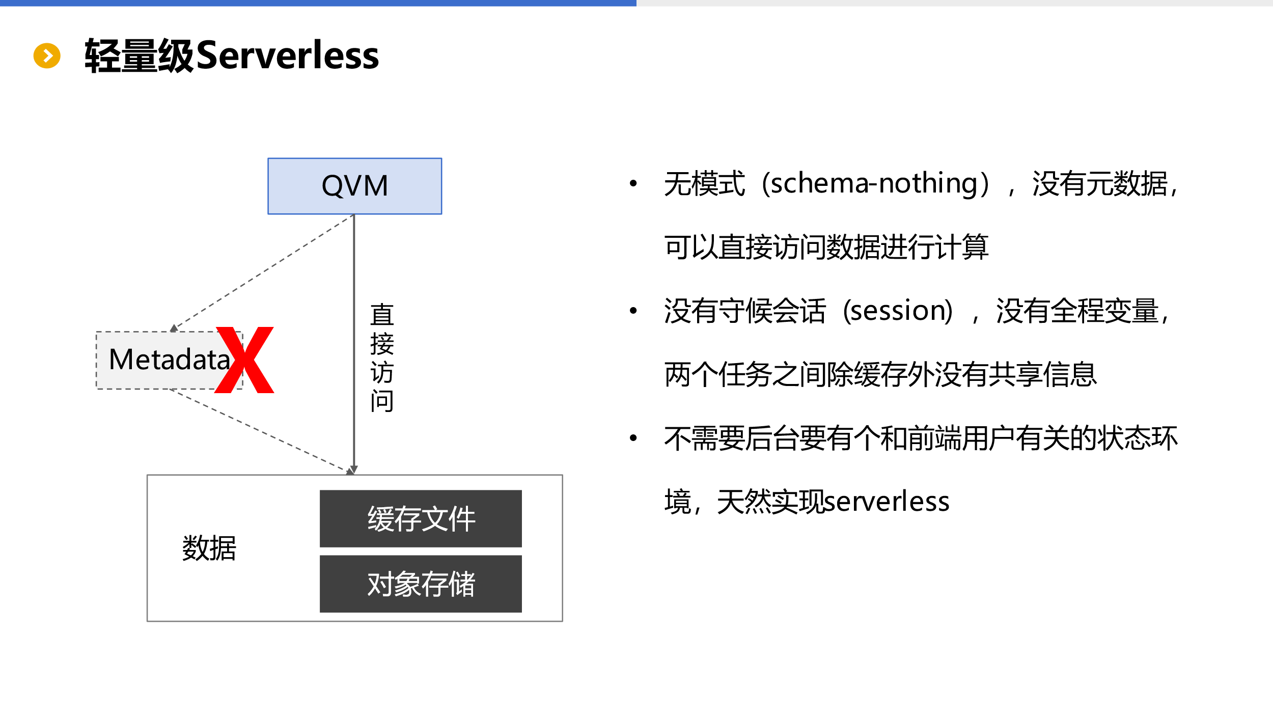 我们知道 SQL 体系(云数据仓库)是需要元数据的,只有加载元数据才能进行计算。元数据如果存储在管理服务上(大部分情况是这样),那在多任务并发时管理服务就很容易成为瓶颈,这时又要考虑管理服务的扩展能力,整体架构不仅更加复杂运维成本高,计算效率也差。而元数据分布再计算服务上则又会由于个性化导致弹性扩展受限,而且加载元数据会导致计算虚拟机启动过慢,同样影响效率。