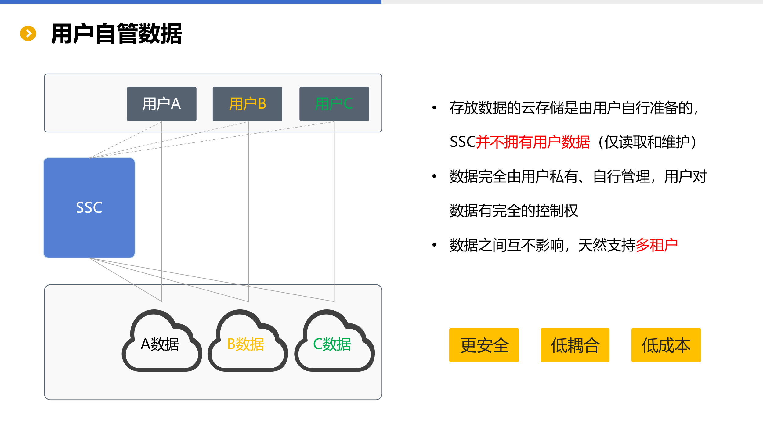 SSC 体系中并不包含用户数据,存放用户数据的云存储由用户自行准备和管理,数据不需要上传到 SSC 中,SSC 并不拥有用户数据,只需要开放相应访问接口供 SSC 访问就可以了。