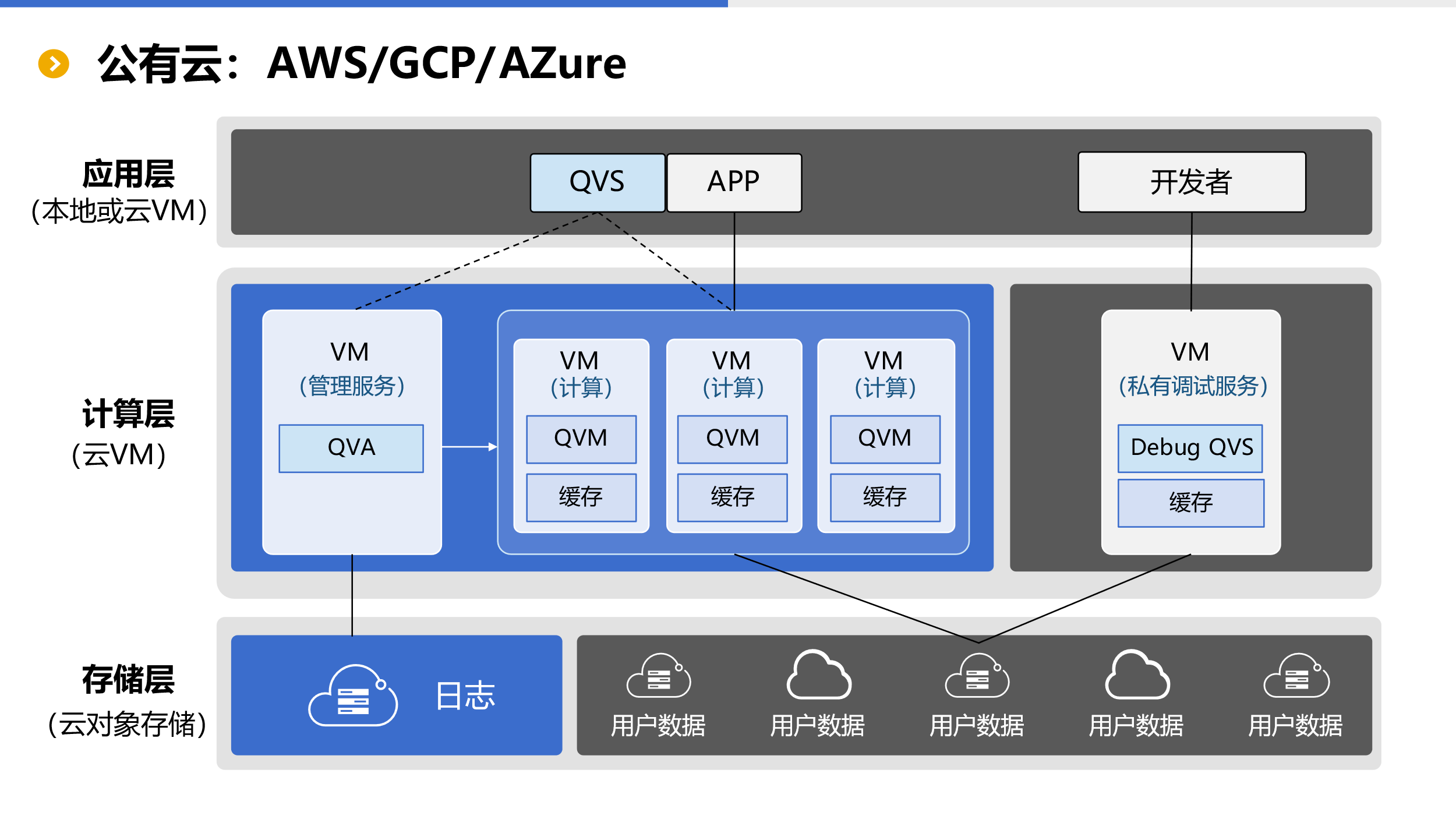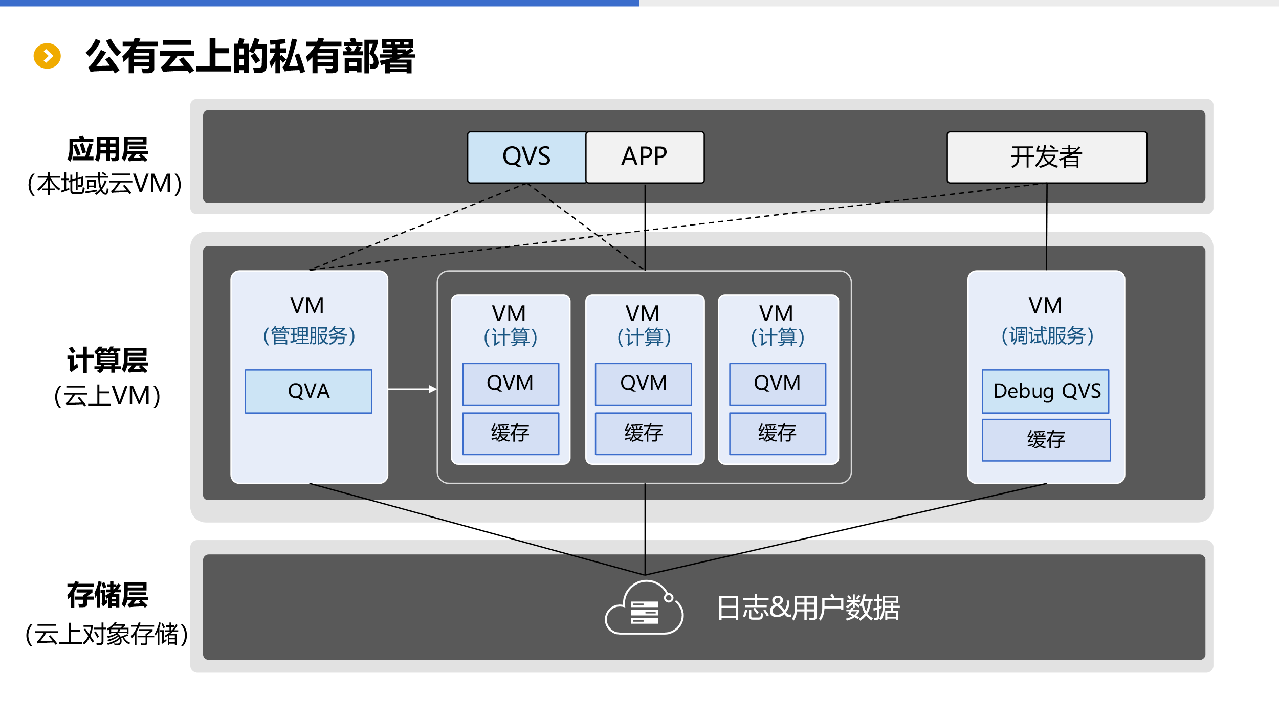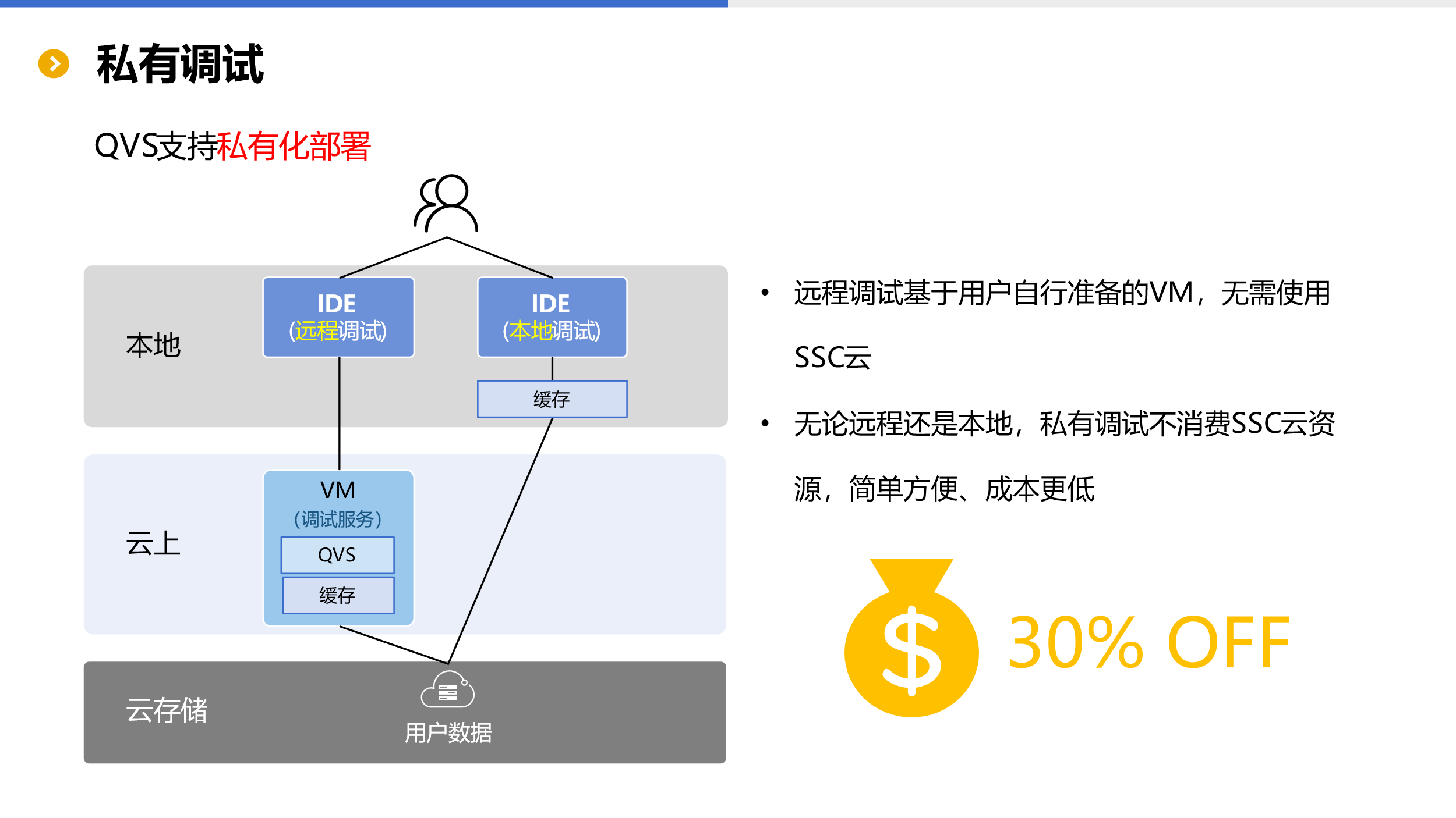 计算层右边部分是用于开发调试的 QVS 服务。与用户数据存储在自己的云上类似,用于调试服务的 QVS 也部署在用户自己的虚拟机上,可以是云上,也可以在本地。调试过程不会消耗 SSC 资源(不产生费用),为用户私有,因此被称为私有调试。
