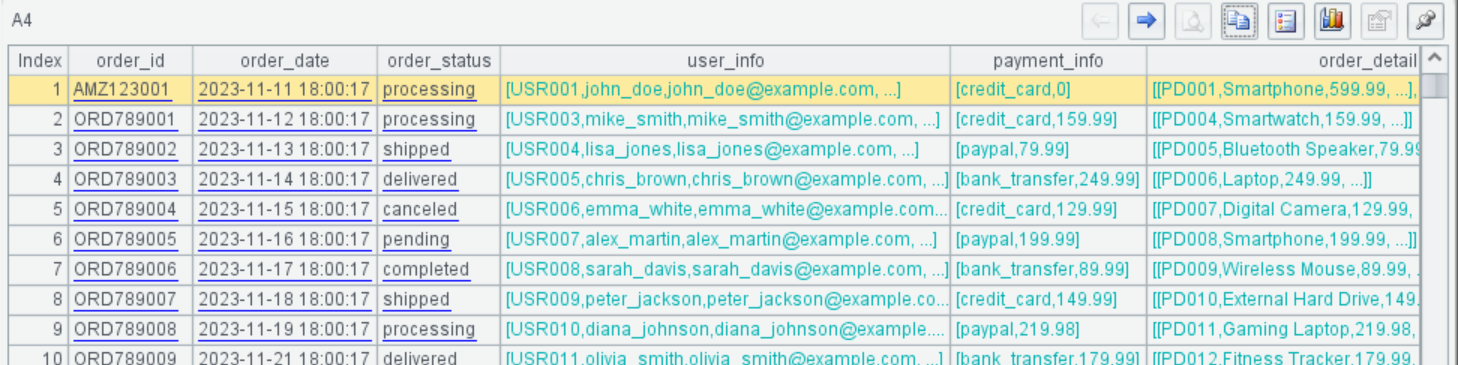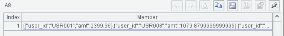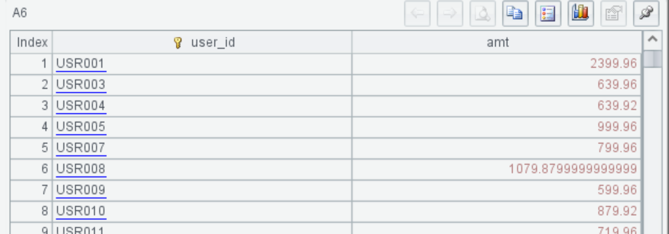 A6:按照用户分组汇总订单金额。这里通过 user_info.user_id 的方式访问多层序表中各个层次的数据(有了多层序表就能天然适应 JSON 的多层结构)