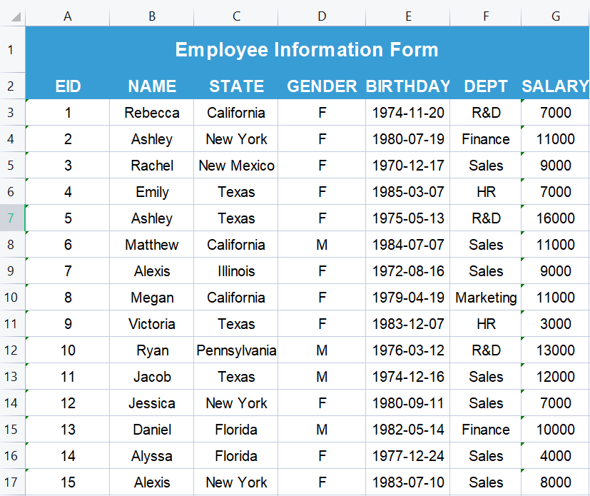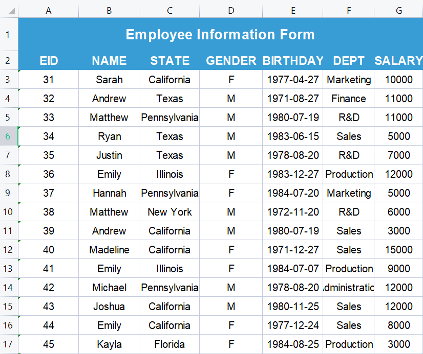 | 1 | =file("E:/employee.xlsx").xlsimport@t() |