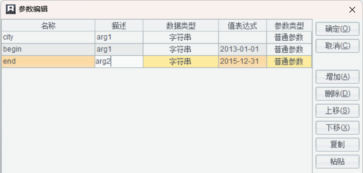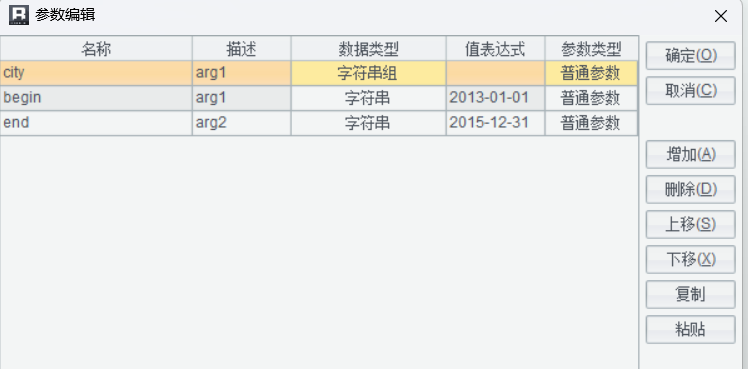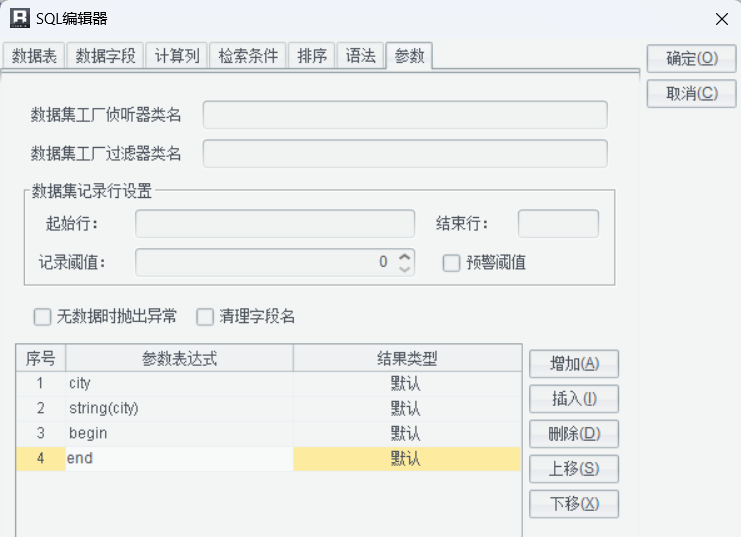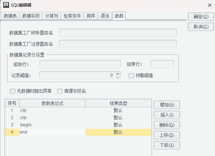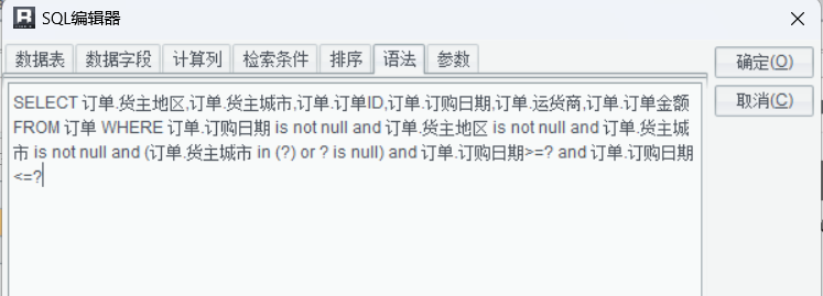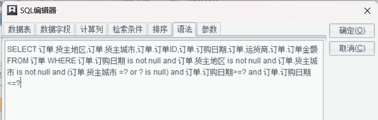 在 sql 的 where 条件中增加了条件 (订单. 货主城市 =? or ? is null),并在对应的参数表达式中设置了两个 city,表示如果 city 参数有值,取货主城市为该城市的数据,如果参数为空,那么就执行后边的 or ? is null,那么就忽略这个条件了。这里注意,根据参数的设置要求,参数表达式这块的值要和 sql 中的问号要一一对应,也就是 sql 中有几个问号,这里要有几个参数表达式,顺序也要完全一致。