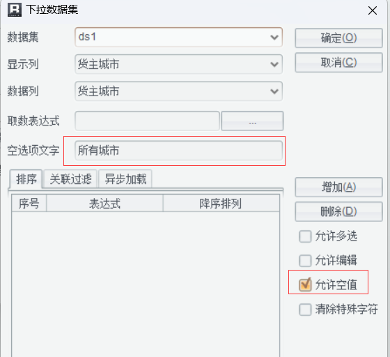 数据集 whrere 条件中,如果需要多选,则 sql 需要写成 货主地区 in (?) 形式,并且在 or ? is null 这个问号对应的参数表达式改成 string(city),使用 string 函数将其转成字符串,否则多选时会报错。