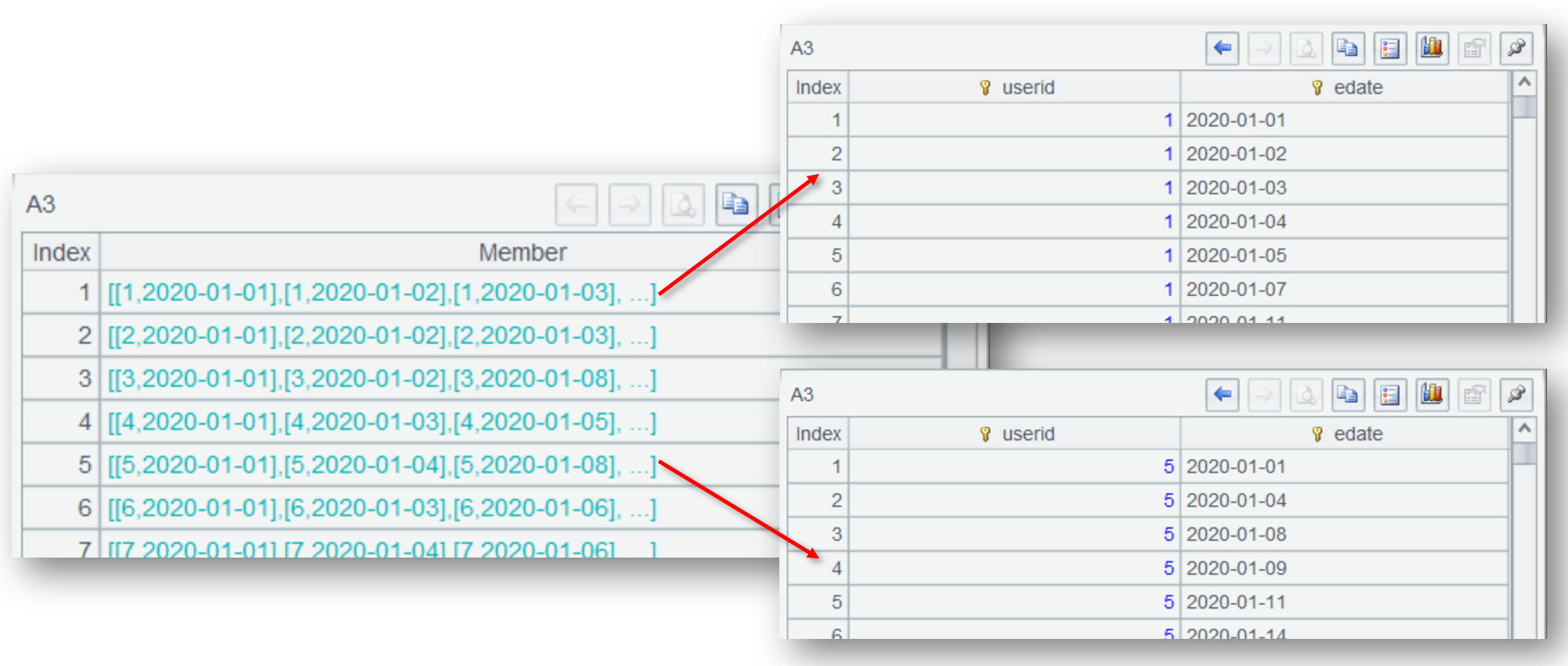 不同于 SQL 分组后要聚合,SPL 的分组可以保留分组子集,以便后续针对分组成员进行计算。像 A3 分组后的结果是这样,分组结果是集合的集合,即每个分组的成员: