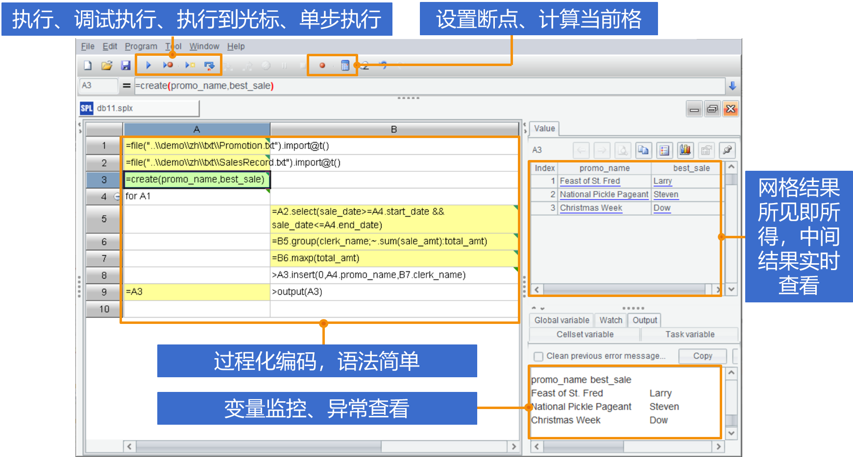 SPL 不仅仅写的简单,IDE 由于提供了丰富的调试功能和可视化结果面板,在交互性上也优于 Python,更远胜 SQL,适合需要探索的数据分析业务。