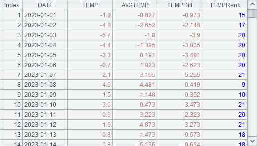 5 =A4.new(bj.DATE:DATE, bj.TEMP:TEMP,all.AVGTEMP:AVGTEMP, round(bj.TEMP-all.AVGTEMP,3):TEMPDiff, all.TEMPRecs.rank@z(bj.TEMP):TEMPRank)