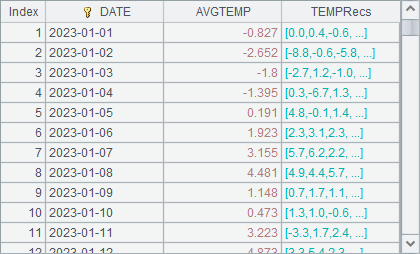 2 =A1.group(DATE; round(~.avg(TEMP),3):AVGTEMP, ~.(TEMP):TEMPRecs)