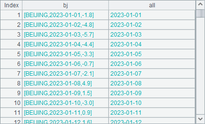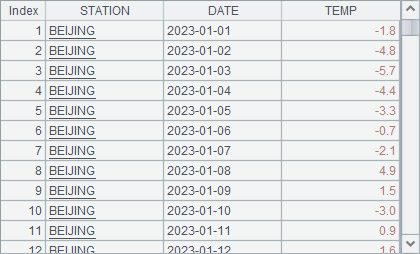 其中 bj 为 BEIJING 站的观测数据,all 为每日全部站点的统计数据。在 A5 中,即可根据连接后的结果,生成结果表,计算时可以按照需要分别引用各自的字段。如用 all.TEMPRecs.rank@z(bj.TEMP),根据全部站点的所有温度数据,获得 BEIJING 站温度的排名,由于需要从高至低,因此添加了 @z 选项。