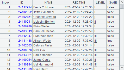 | 4 | =joinx(A2:Reg,ID;B3:Info,ID) | =A4.new(Reg.ID:ID, Reg.NAME:NAME, Reg.REGTIME:REGTIME, Reg.LEVEL: LEVEL, Reg.LEVEL == Info.STATE.LEVEL:SAME) | |