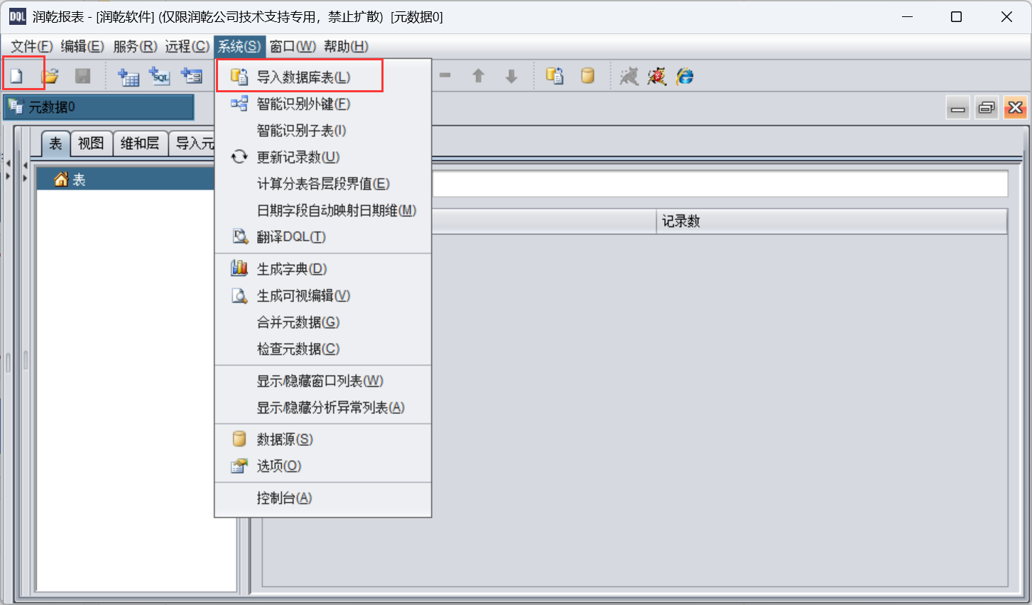 在菜单栏 新建 - 元数据,然后 导入数据库表,将要使用的表都导入。