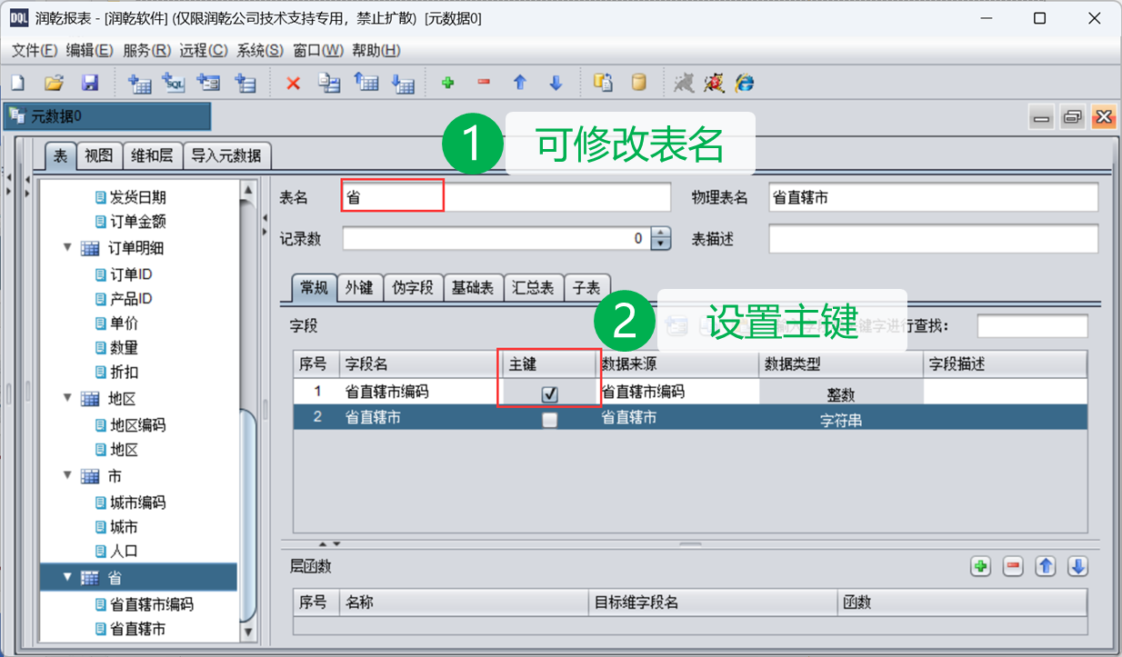 接下来继续添加元数据定义。表名可以修改,并设置每个表的主键。DQL 要求所有表必须设置主键(逻辑主键)。