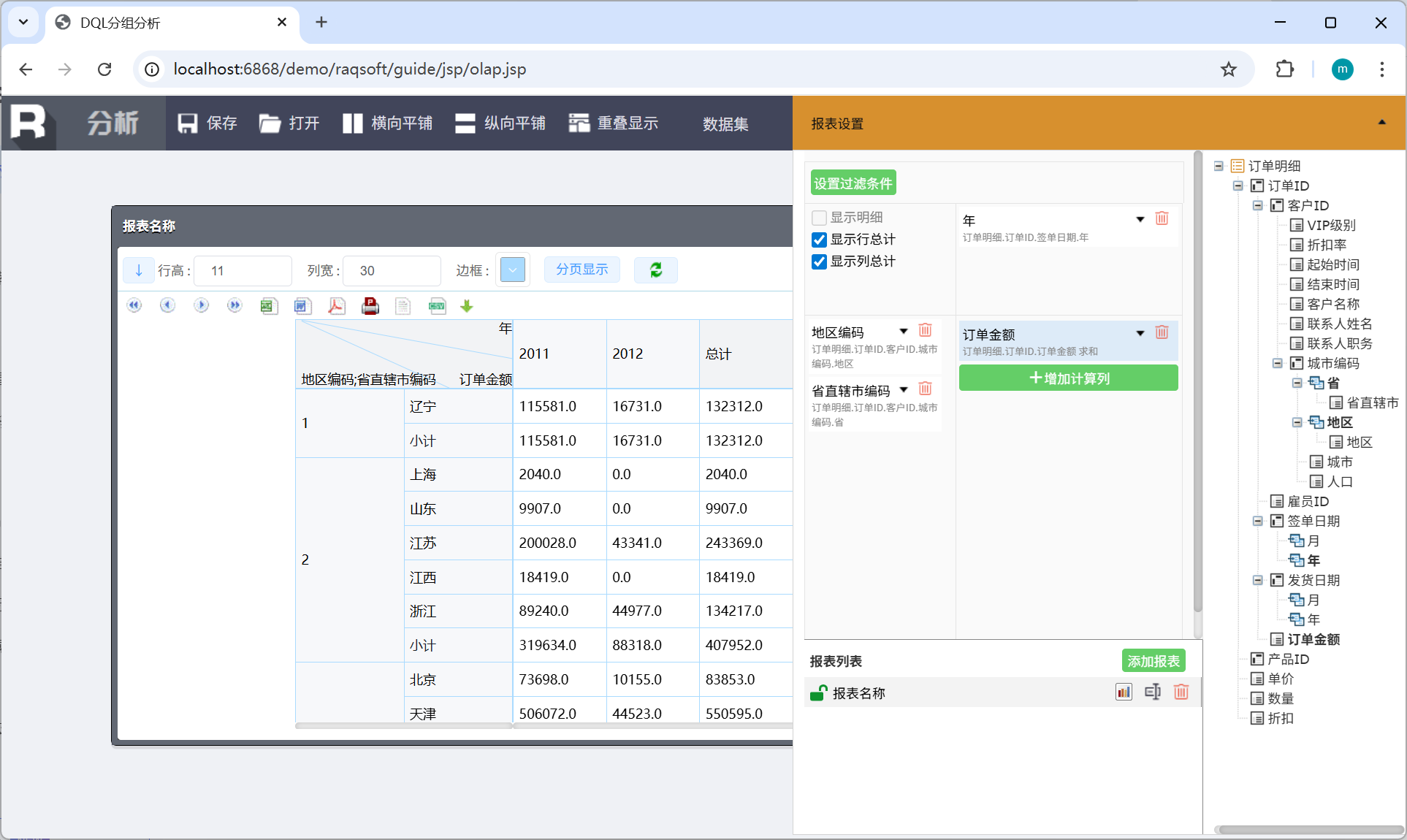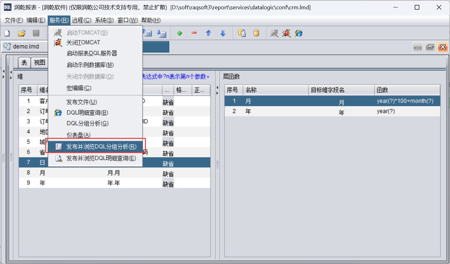 到此为止,我们就做完了元数据。我们可以一次性把这个数据库的表间关系都描述清楚,这样就能查询所有数据了。把做好的元数据发布到 WEB 端查询一下(需事先通过 服务菜单 启动内置 Tomcat 和 DQL 服务器)。