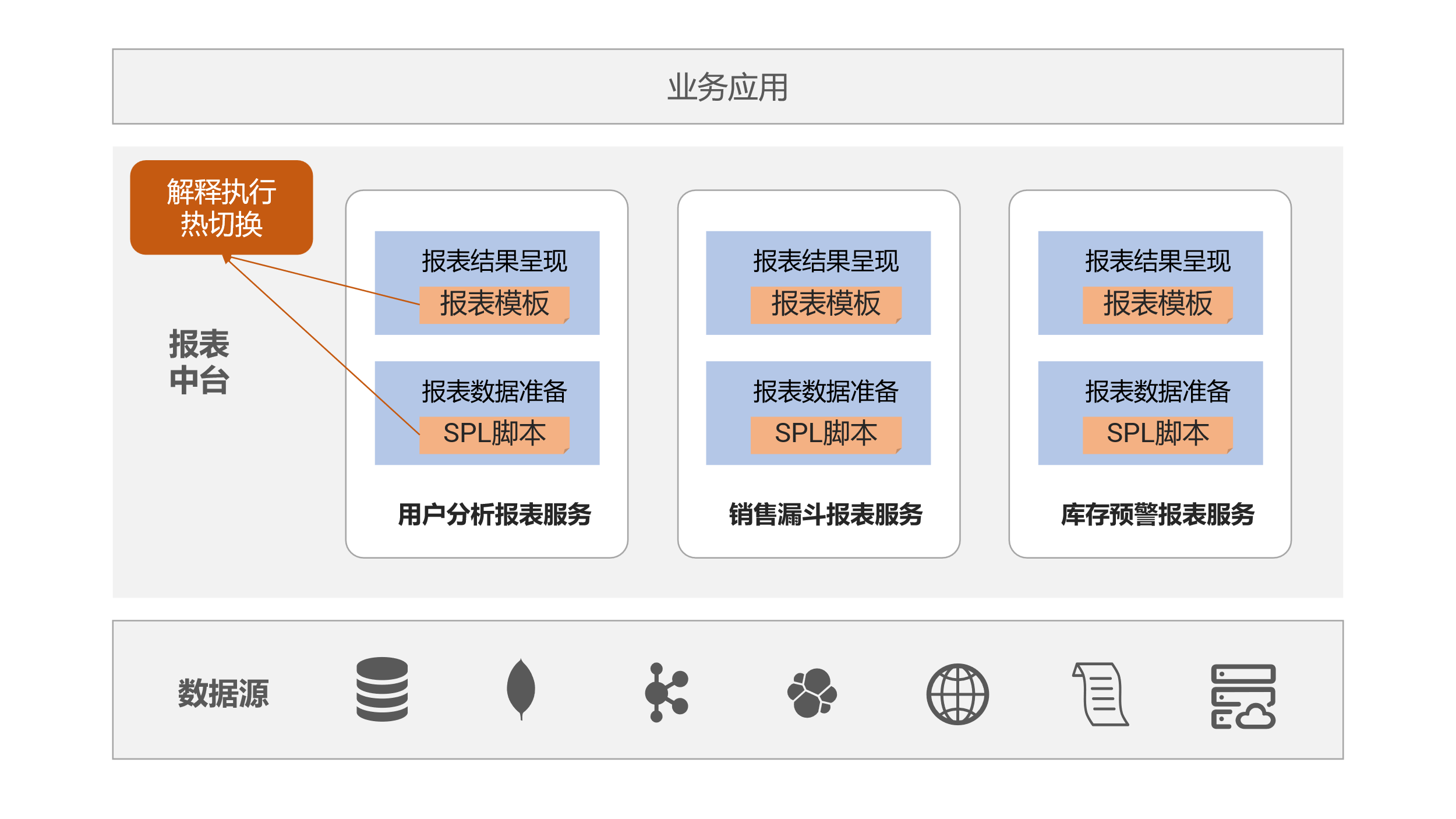 热部署:修改报表逻辑或数据计算规则,只需更新 SPL 脚本和报表模板,两部分都是解释执行的,可以热切换,修改无需重启服务实时生效
