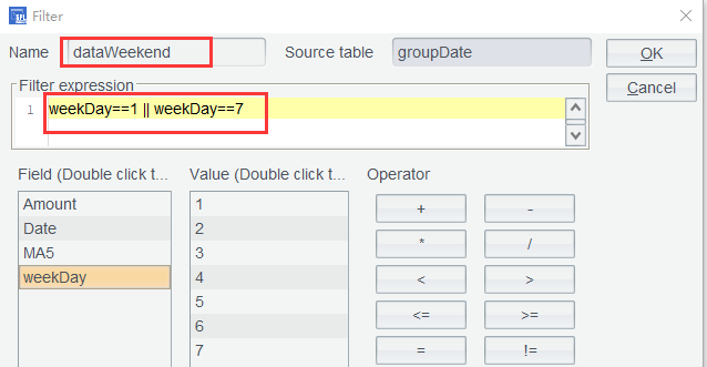 第二步:groupDate 中选出周末的数据,使用表达式weekDay==1 || weekDay==7过滤: