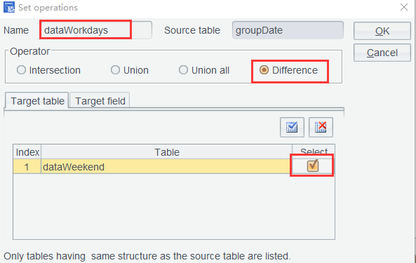 如图设置结果表名,运算符集,并选中目标表dataWeekend
