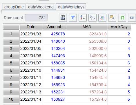 该步的含义为,计算 groupDatedataWeekend 的差集,也就是从 groupDate 中去掉周末的数据,留下的自然是工作日数据: