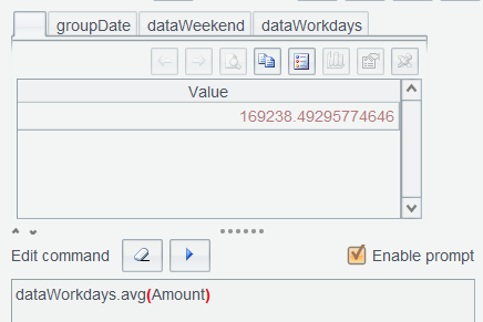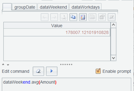 第四步: 在手写命令区分别计算dataWeekend.avg(Amount)dataWorkdays.avg(Amount)