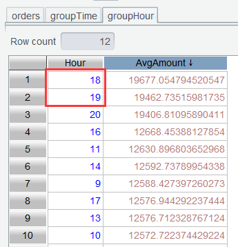 第三步: 双击 AvgAmount 列表头,将 AvgAmount 按降序排列,可以看到销售高峰时段: