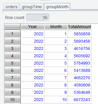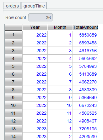 由于只需要最终统计表,故不需要先增加包含年和月的计算列。可以直接对 orders 用年月表达式作为分组表达式。